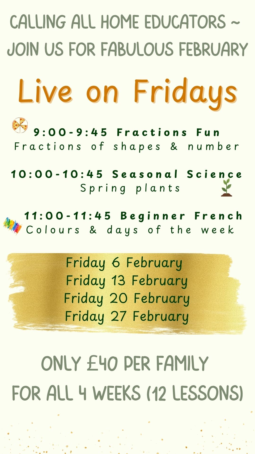 £40 for the 4 weeks for all 3 subjects (12 lessons in total).